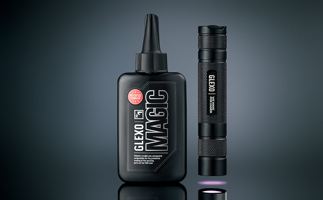 Набор Glexo Magic PDR представляет собой специализированный однокомпонентный УФ-отверждаемый состав, специально разработанный для создания сверхпрочного, ультратонкого защитного покрытия на рабочих частях инструментов PDR. Состав характеризуется высокой прочностью и пластичностью, а его высокая вязкость облегчает нанесение на любой PDR-инструмент. Одной упаковки 100мл достаточно более чем на 350 применений на любом PDR-инструменте. Учитывая очень долгий срок службы покрытия, Glexo Magic является самым экономичным и эффективным решением для использования с PDR-инструментами.